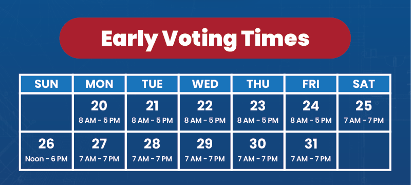 Early Voting begins on Monday, October 20 and ends on Friday, October 31.